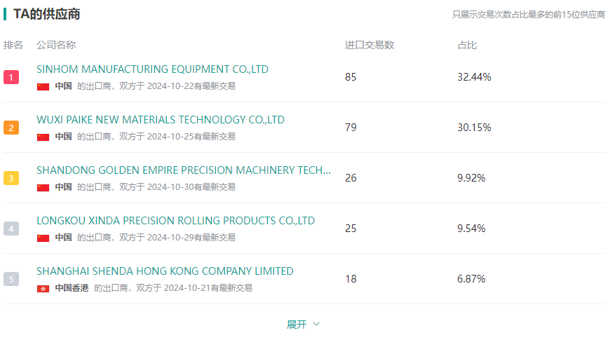 这里我们可以看到该采购商的 15 个供应商名称