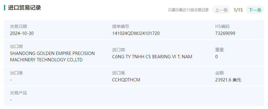 这里我们可以看到越南最近6个月采购滚动轴承的其他零件的相关数据: