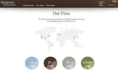 世达国际律师事务所(Skadden、Arps、Slate、Meagher&Flom LLP)及其附属公司拥有22个办事处、大约1700名律师和50多个不同的业务领域,为每个主要国际金融中心的客户提供服务,为各个行业的具体法律咨询公司提供服务。
