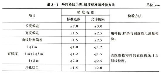 号料检验员在进行号料检验时,必须了解工艺符号的种类与定义,号料检验通常是巡视检验。号料检验的主要检验内容、精度标准与检验方法可参见表。