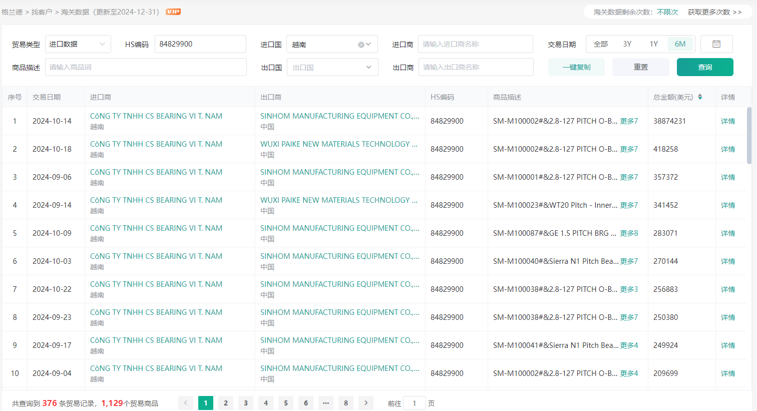 在“HS编码”中输入“84829900”进口国“越南”交易时间选择最近“6M”就是最近6个月进口数据信息