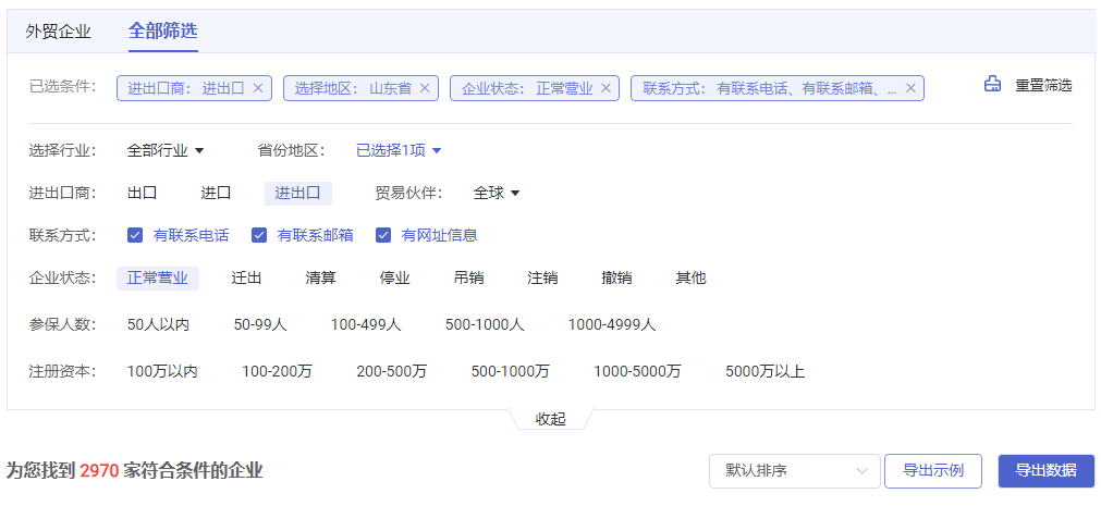 其中正常营业、有电话联系方式、有邮箱联系方式、有网址信息的山东进出口贸易公司有2970家。